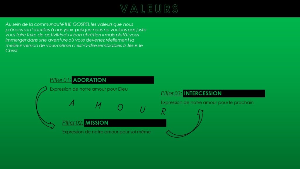 C’est dans cette logique qu’au sein de la communauté THE GOSPEL les valeurs que nous prônons sont sacrées à nos yeux puisque nous ne voulons pas juste vous faire faire de activitésdu « bon chrétien » mais plutôt vous immerger dans une aventure où vous devenez réellement la meilleur version de vous-même c’est-à-dire semblables à Jésus le Christ.